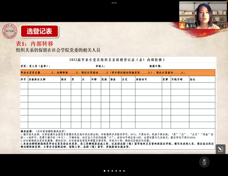 紧接着,李老师根据毕业生党员升学、工作、留校、出国等不同毕业去向,分类对相应的党组织关系转出流程做具体介绍。